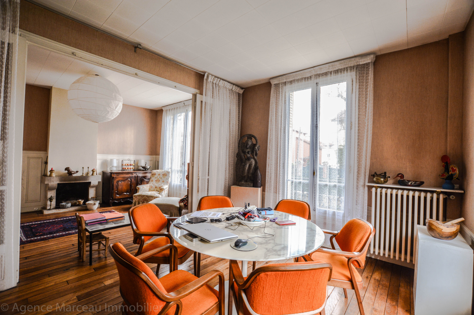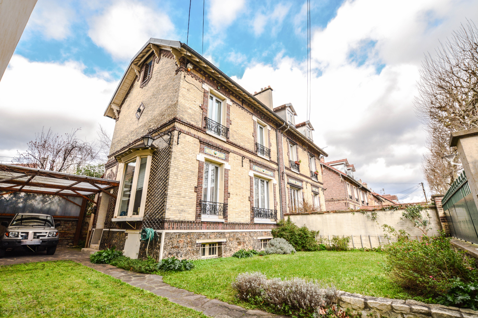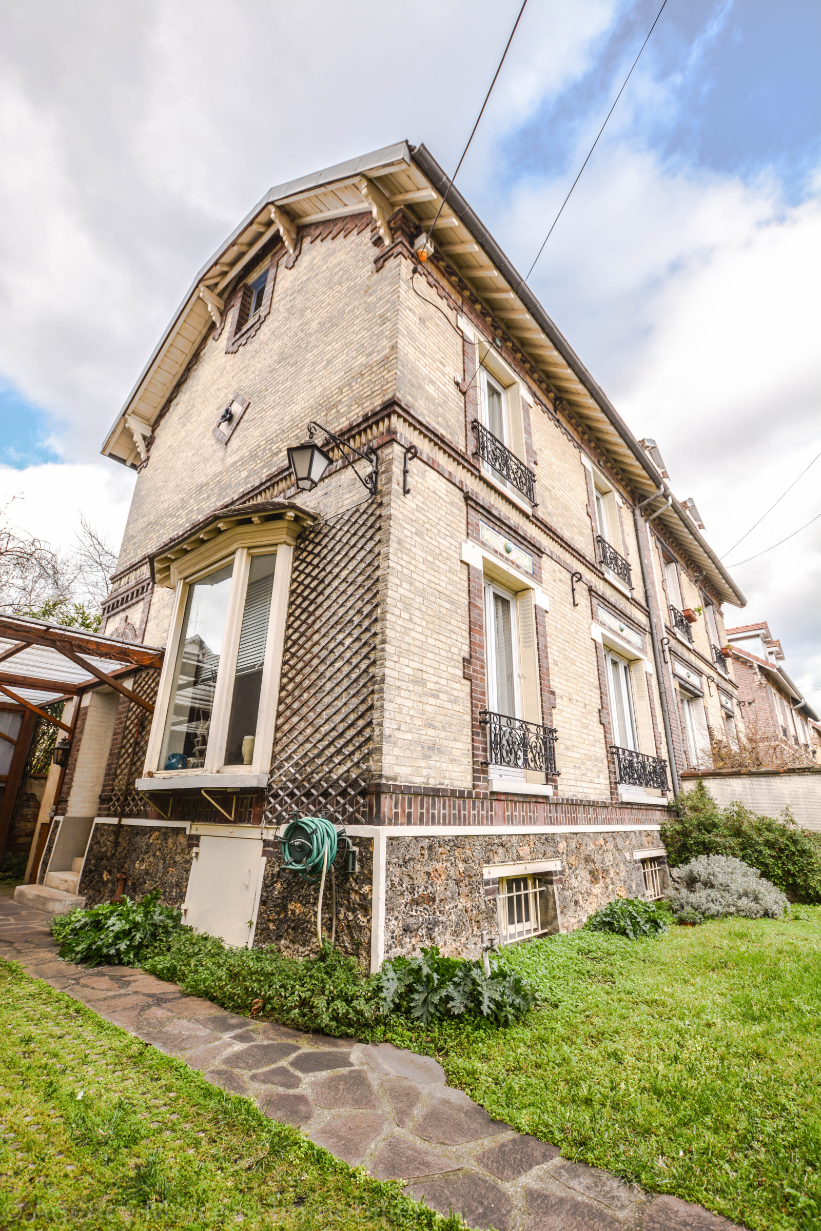 Exclusivité Agence Marceau - AMEPI. Courbevoie - République. Sur une parcelle de 195m² et située dans un quartier recherché, jolie maison ancienne R+2 à rafraîchir des années 1900 d'une surface habitable de 126m² environ, en briques et meulières, mitoyenne d'un côté, offrant au rez-de-chaussée surélevé: une entrée avec vestiaire, un vaste double séjour ensoleillé avec cheminée, donnant sur le jardin exposé Sud, une cuisine séparée équipée, un wc séparés d'invité. Au 1er étage: un bureau (ou chambre d'enfant), deux chambres spacieuses dont l'une avec sa salle de douches/wc attenante, cheminée et penderie. Au 2ème étage, une chambre spacieuse, salle bains, deux chambres en enfilade avec point d'eau, placards et rangements. Sous-sol total avec cave à vin, atelier, buanderie et chaufferie (fioul). Jardin de 100m² environ. Préau (carport pour le stationnement de 2 voitures). Calme. Maison en pleine propriété.Taxe foncière: 404 euros. Proche transports et écoles. Bien rare dans le secteur.